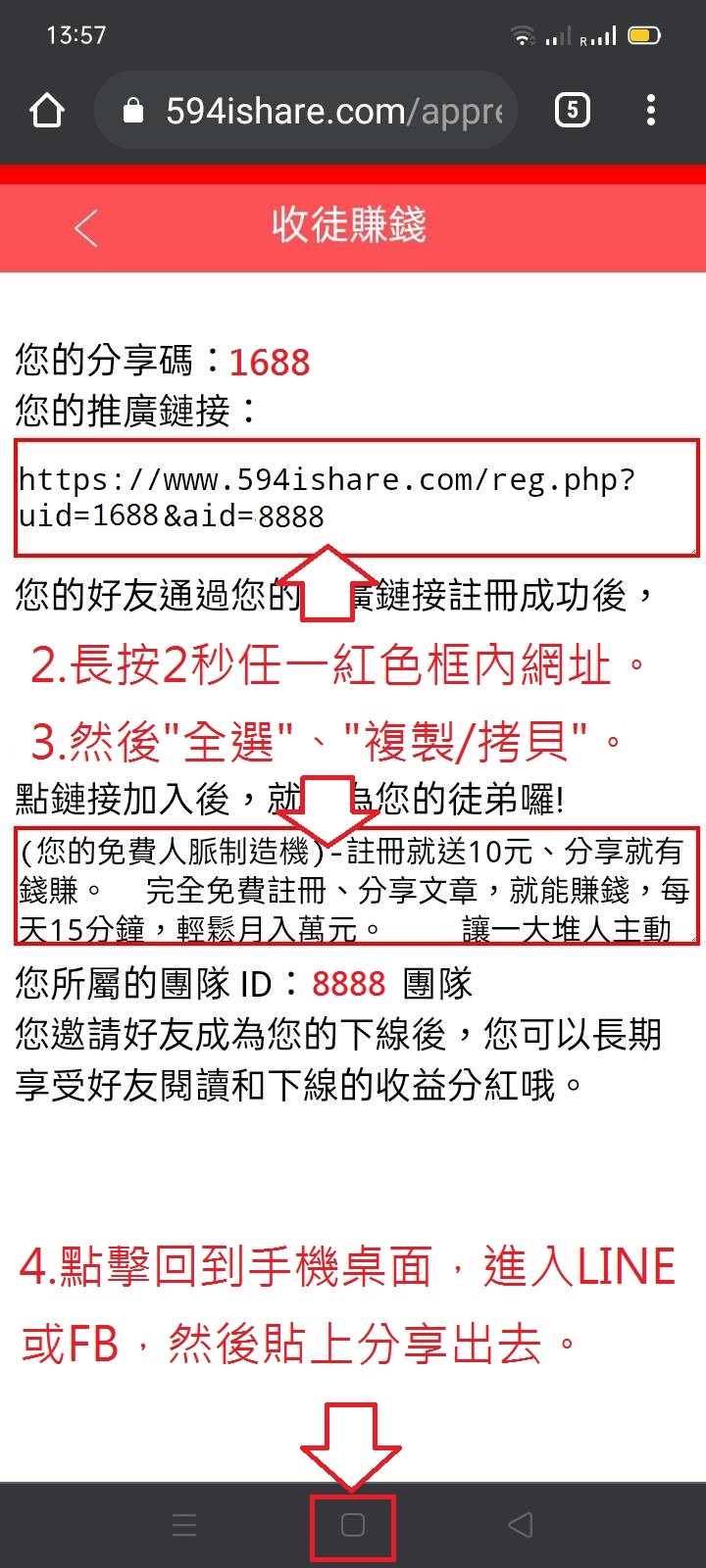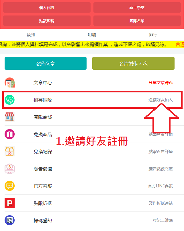 1.點擊"招募團隊" ,將您個人專屬推廣鏈接或複製下方紅框內鏈接訊息,傳送給朋友邀請加入。